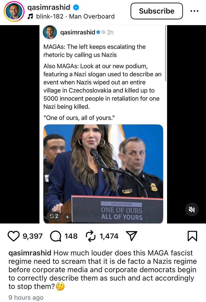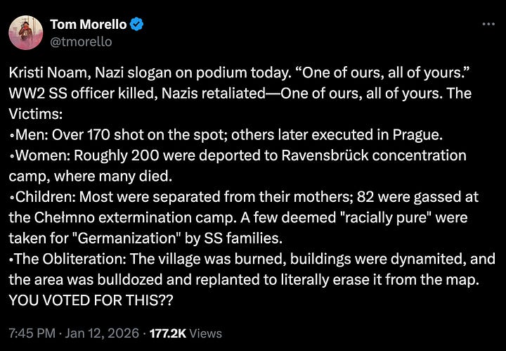 I could easily make the argument that Kristi Noem’s new slogan matches the rhetoric of Nazi Germany, because it does. I mean, Hitler literally called for the “annihilation of the Jewish race” as mass retribution for their perceived betrayals to the German nation. One assassinated leader results in 100s of villagers killed. One of ours, all of yours. The connection is clear to a casual audience even if the exact slogan itself was not present at the time.